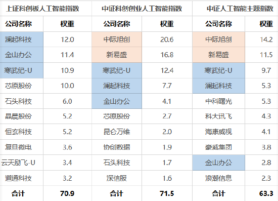 表2:三只东谈主工智能关系指数前十大成份股对比